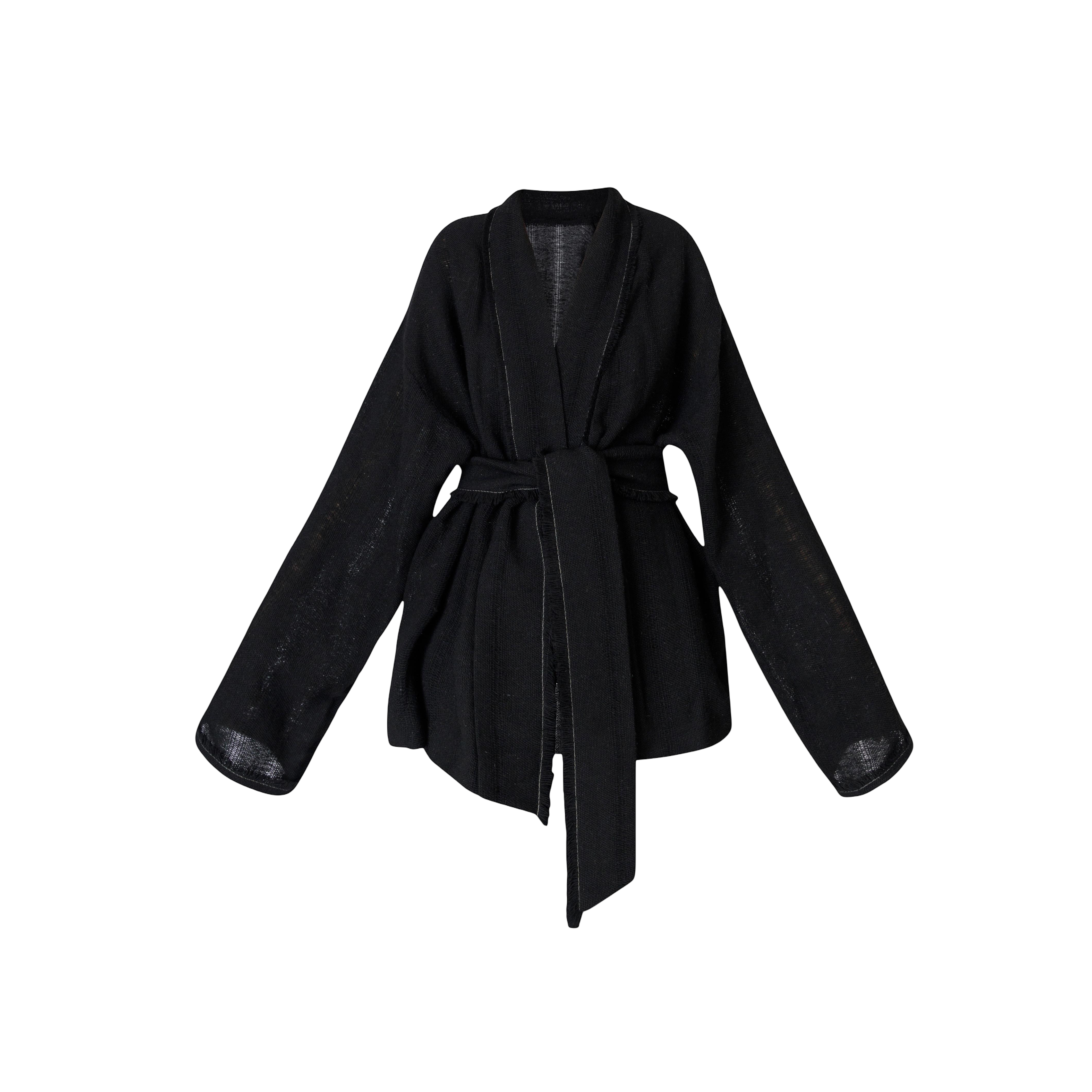 • This piece combines classic wrap tailoring with the warmth and texture of natural wool, offering comfort and timeless appeal.