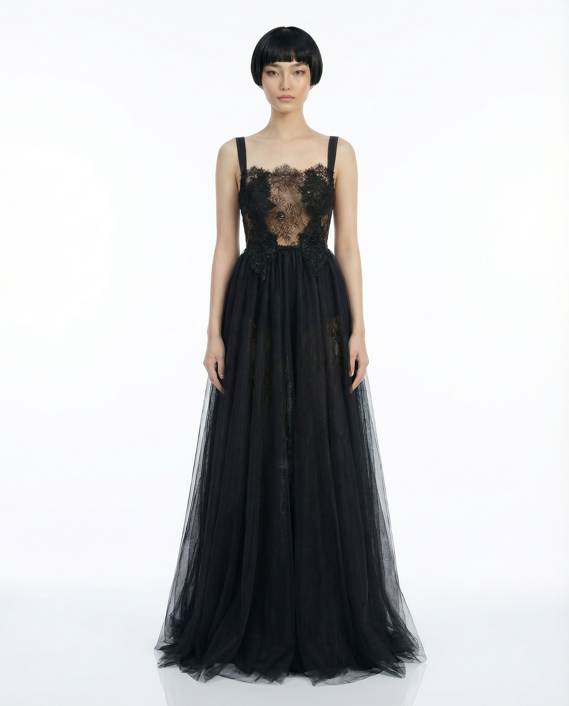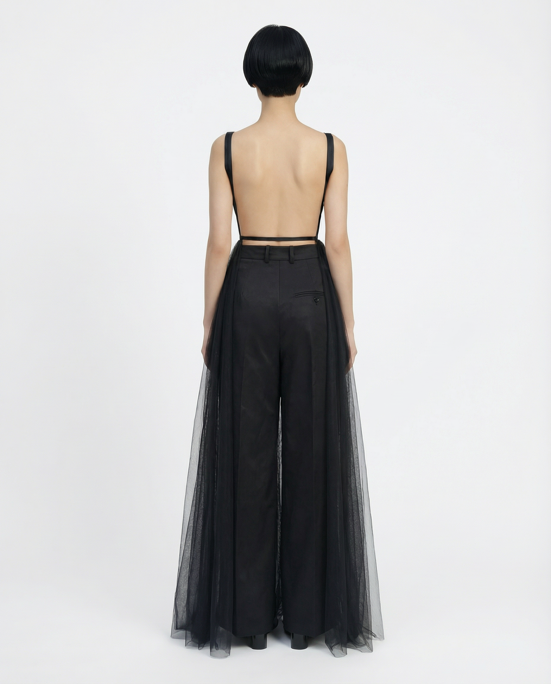 •Two-piece overall construction with open-back. •Front panel in hand-embroidered lace, cut in an apron-like shape. •Back component in layered tulle and lace, cut on the bias for fluid movement.