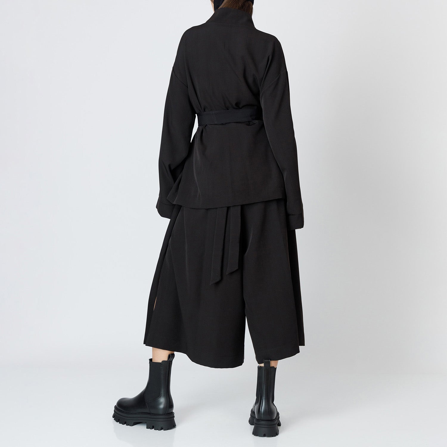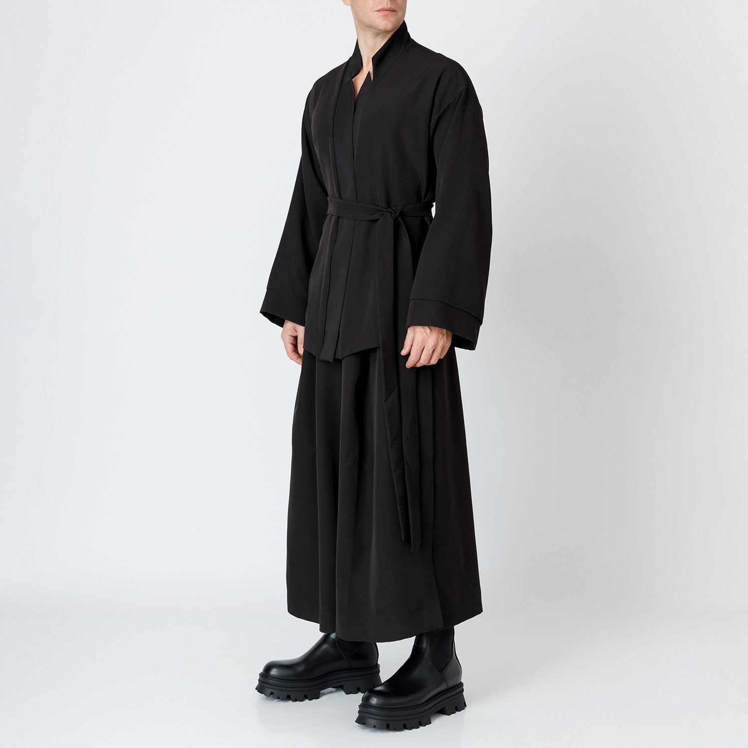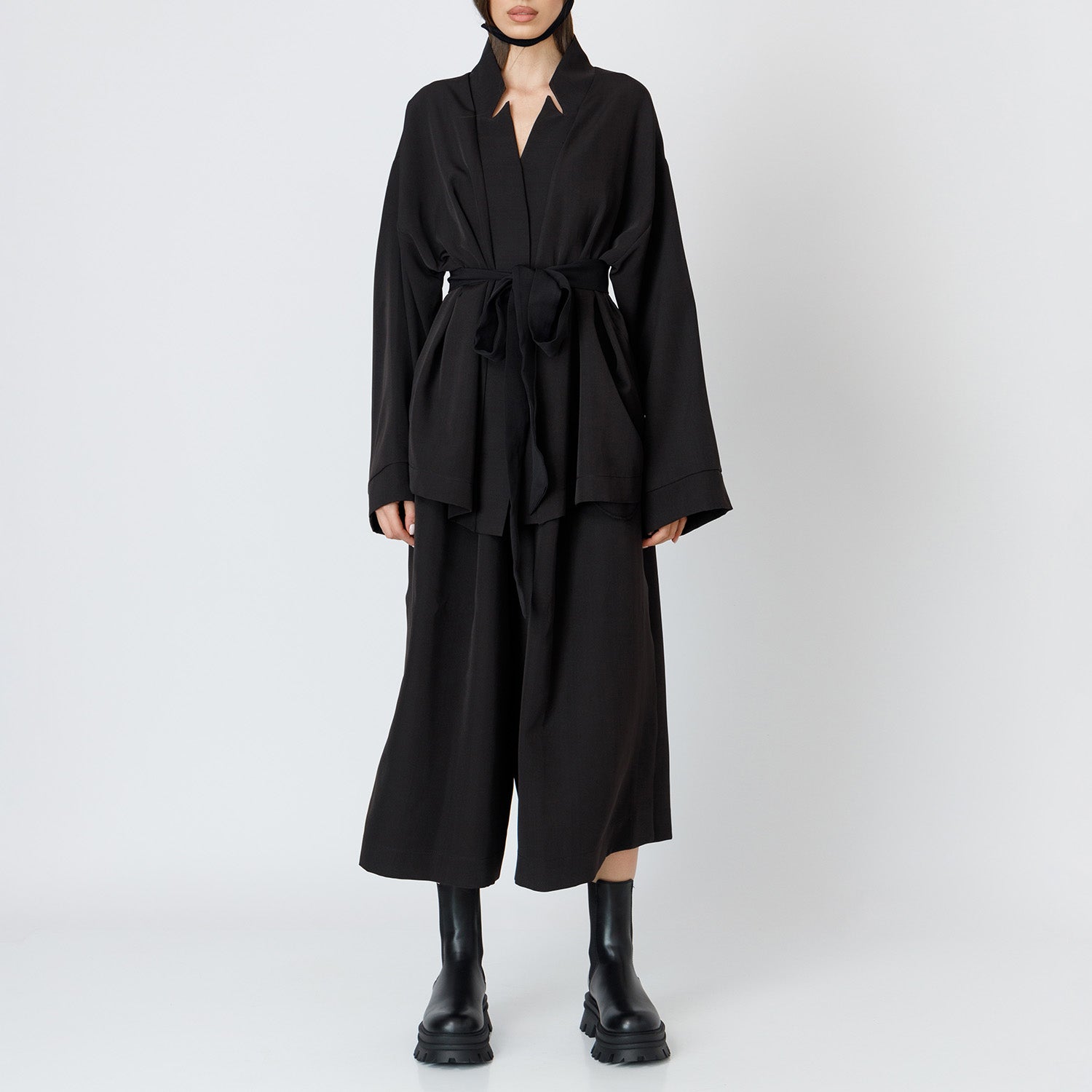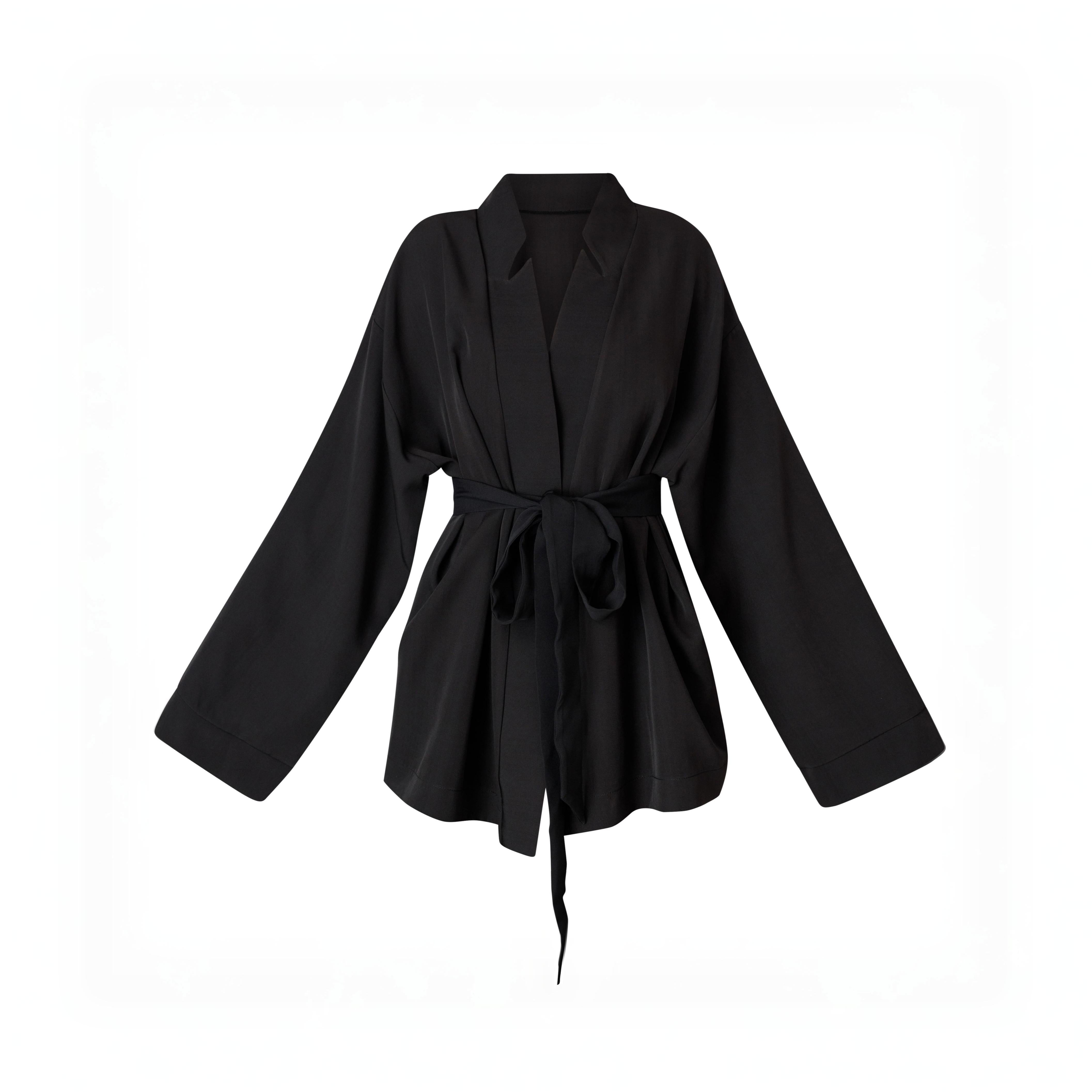 This wrap blazer is crafted from structured fabric and features a sleek shawl collar with a V-neckline. Its mid-length cut and long sleeves offer a clean, modern silhouette. • The self-tie belt cinches the waist for a defined shape, while the relaxed fit ensures ease of movement and layering. This piece blends tailored elegance with everyday practicality. • This is a unisex item graded in standard men’s sizing. The fit is oversized. • The smooth fabric has a firm hand feel with slight stretch, providing structure and comfort. • Color: Black. • Material: 95% Polyester, 5% Elastane. • Washing instructions: Gentle cycle • Model is 183 cm tall. • Model wears size M. • Model’s measurements: Bust 105 cm, Waist 85 cm, Hip 93 cm.