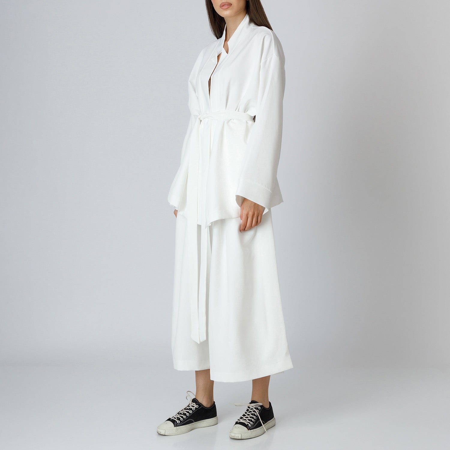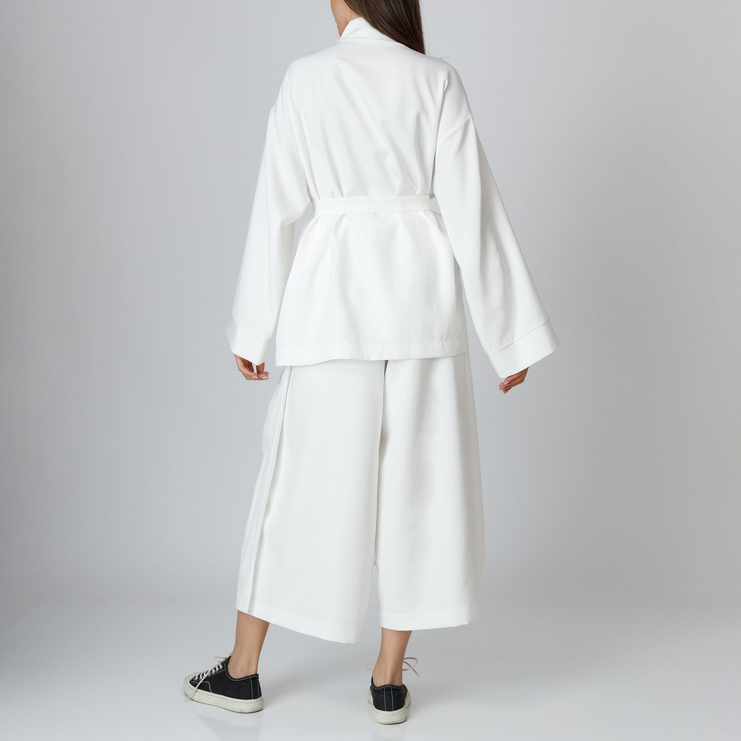 • These palazzo trousers are crafted from a cotton-blend fabric with a soft drape and subtle stretch. The wide-leg silhouette is complemented by front pleats that enhance structure and fluidity.